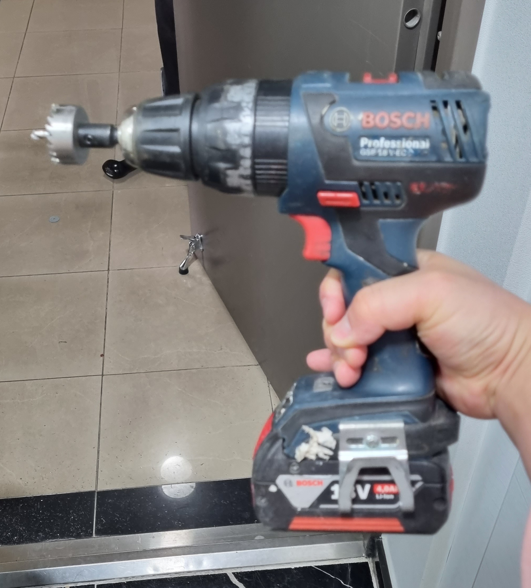 가장먼저 할 것은 새 도어락에 맞게 방화문에 구멍 뚫기