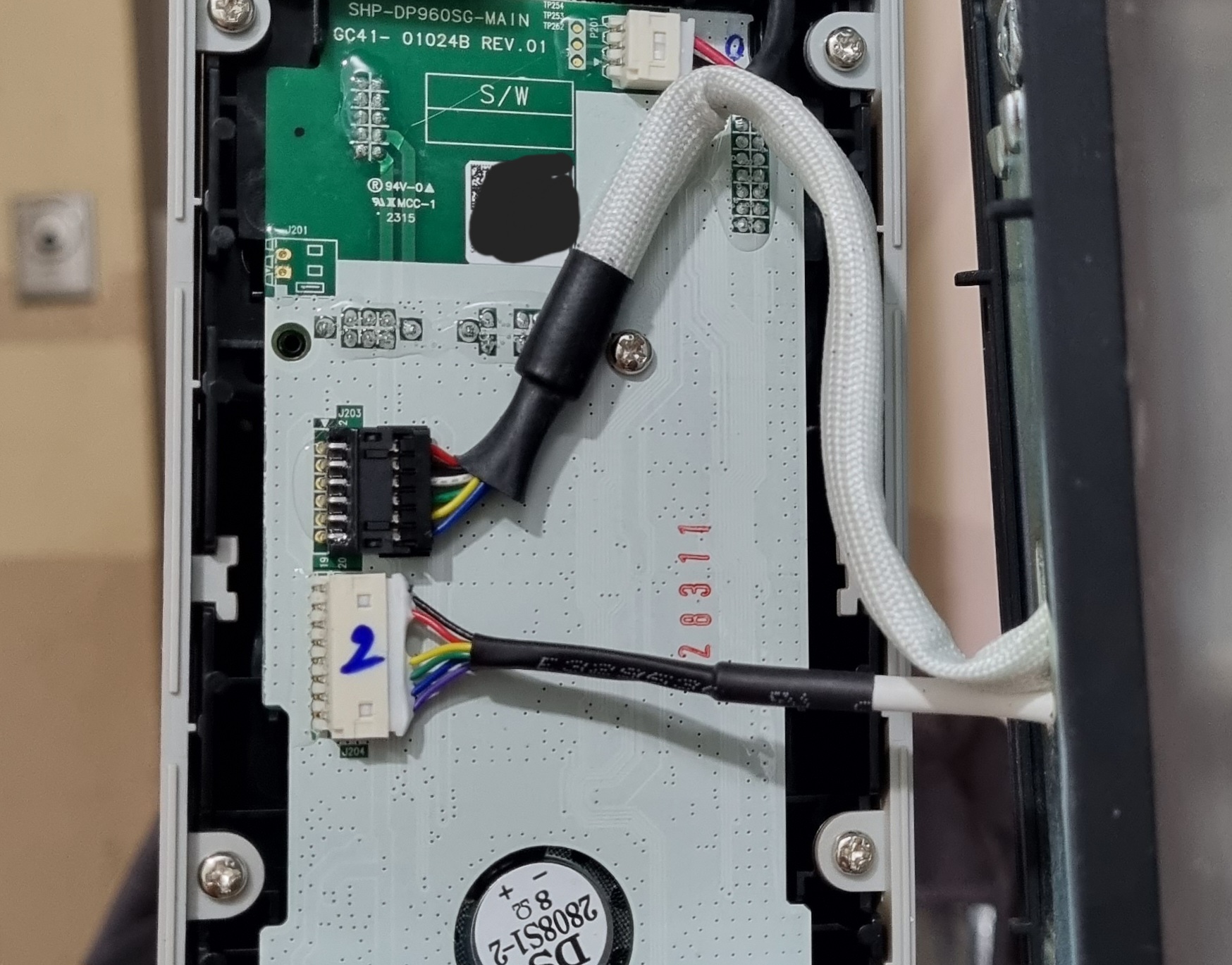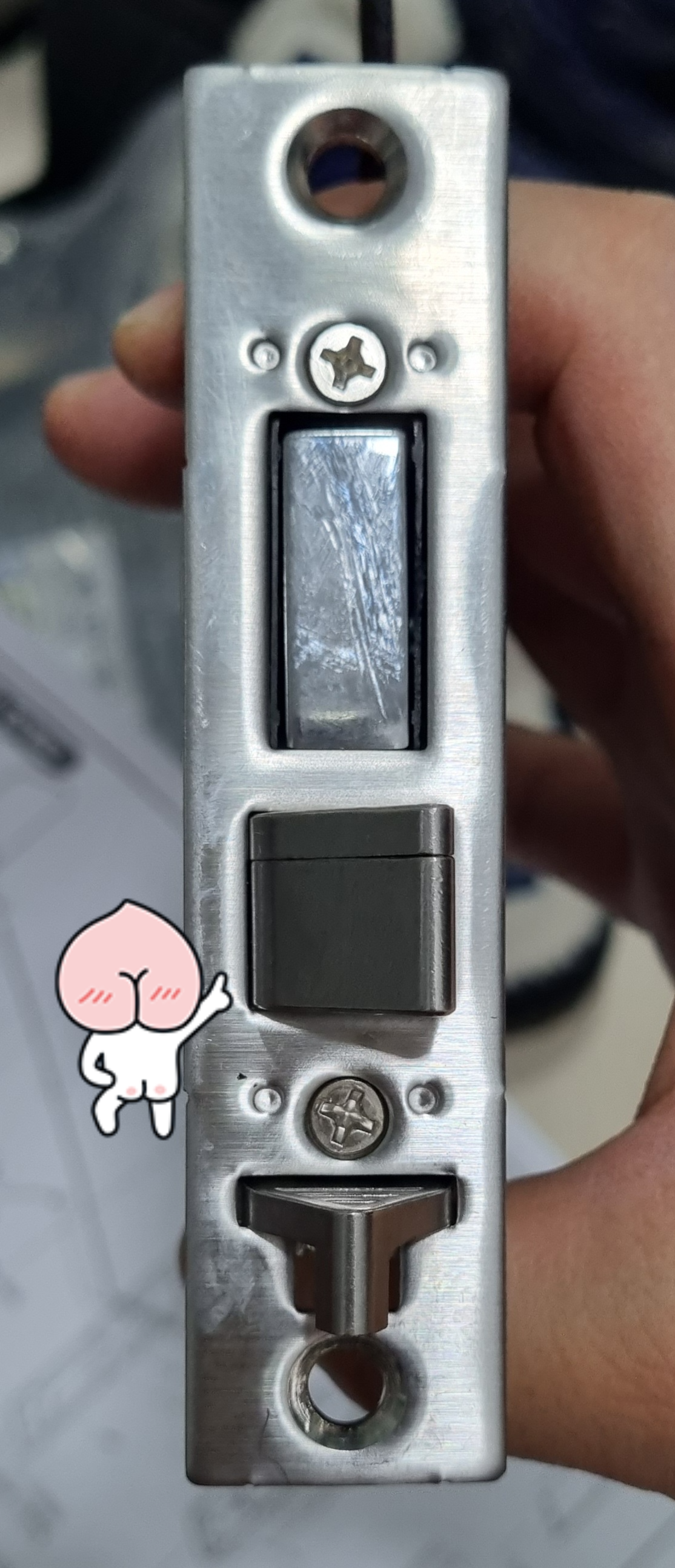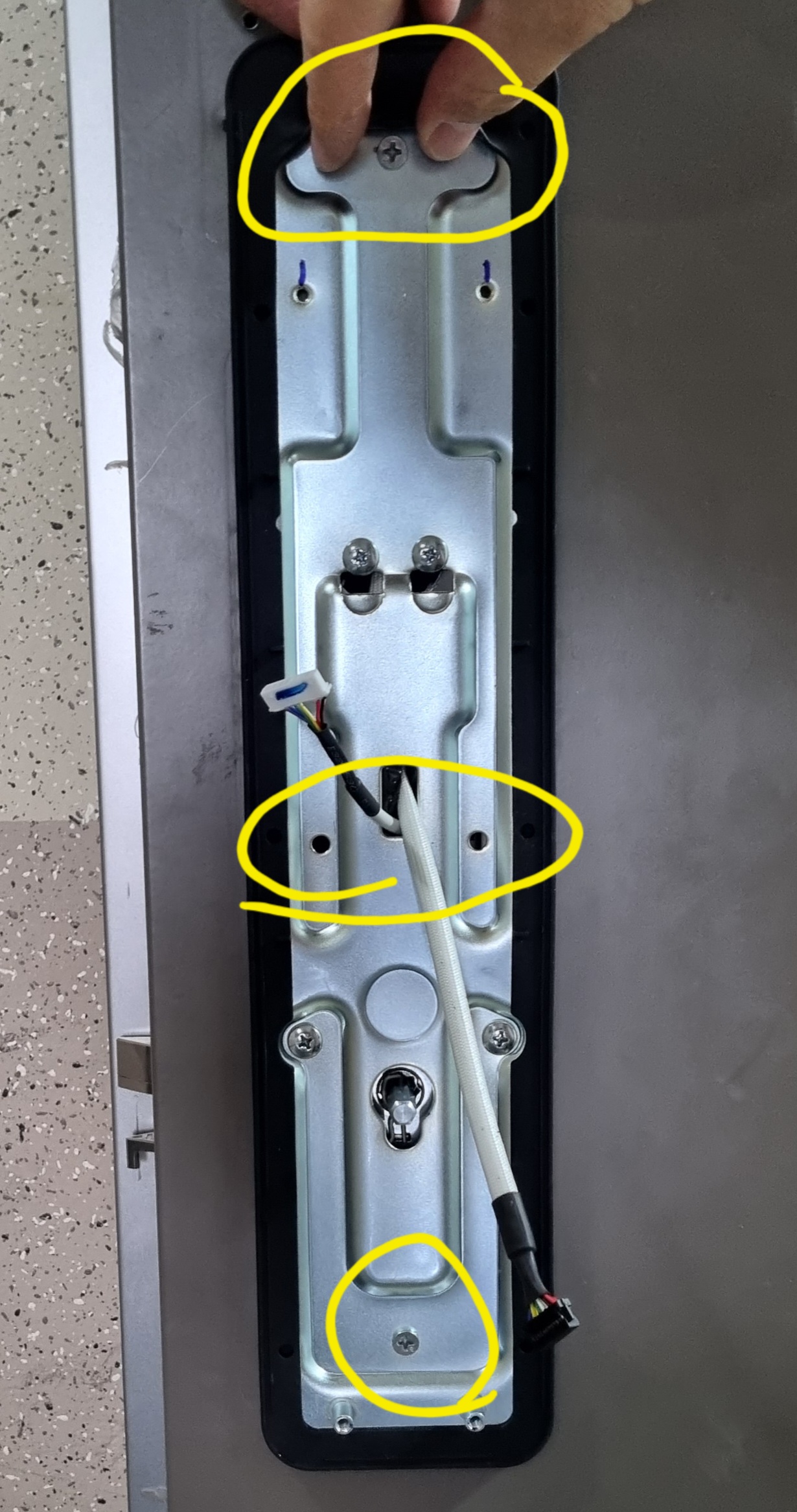 - 위 / 아래의 나사 4개를 풀고, 도어락 뒷판을 2~3cm 정도 뜯어서 기판에 연결된 2개의 선을 뽑음