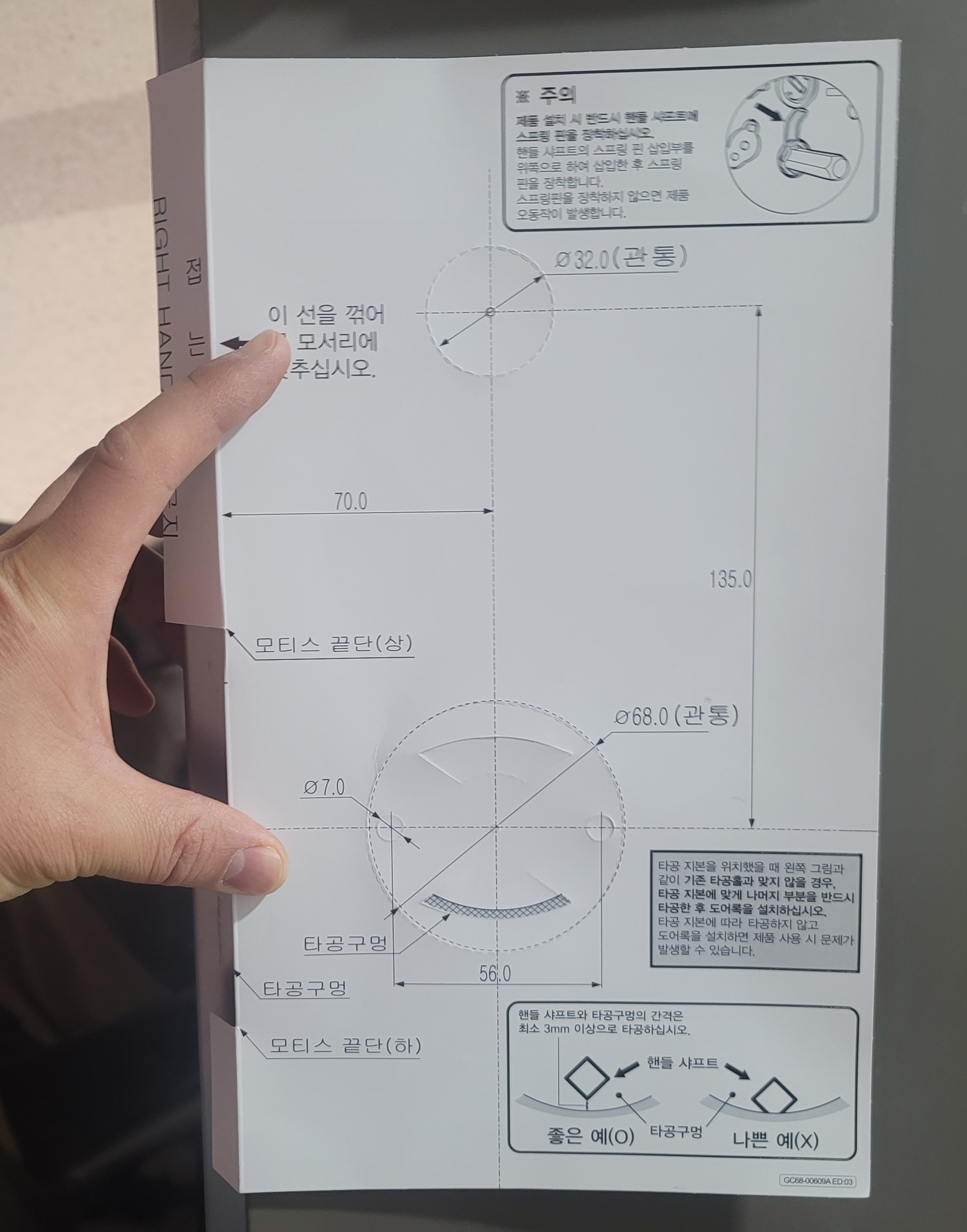 - 표준 방화문이 아니거나 기존에 도어락이 없었다면 68mm 홀쏘